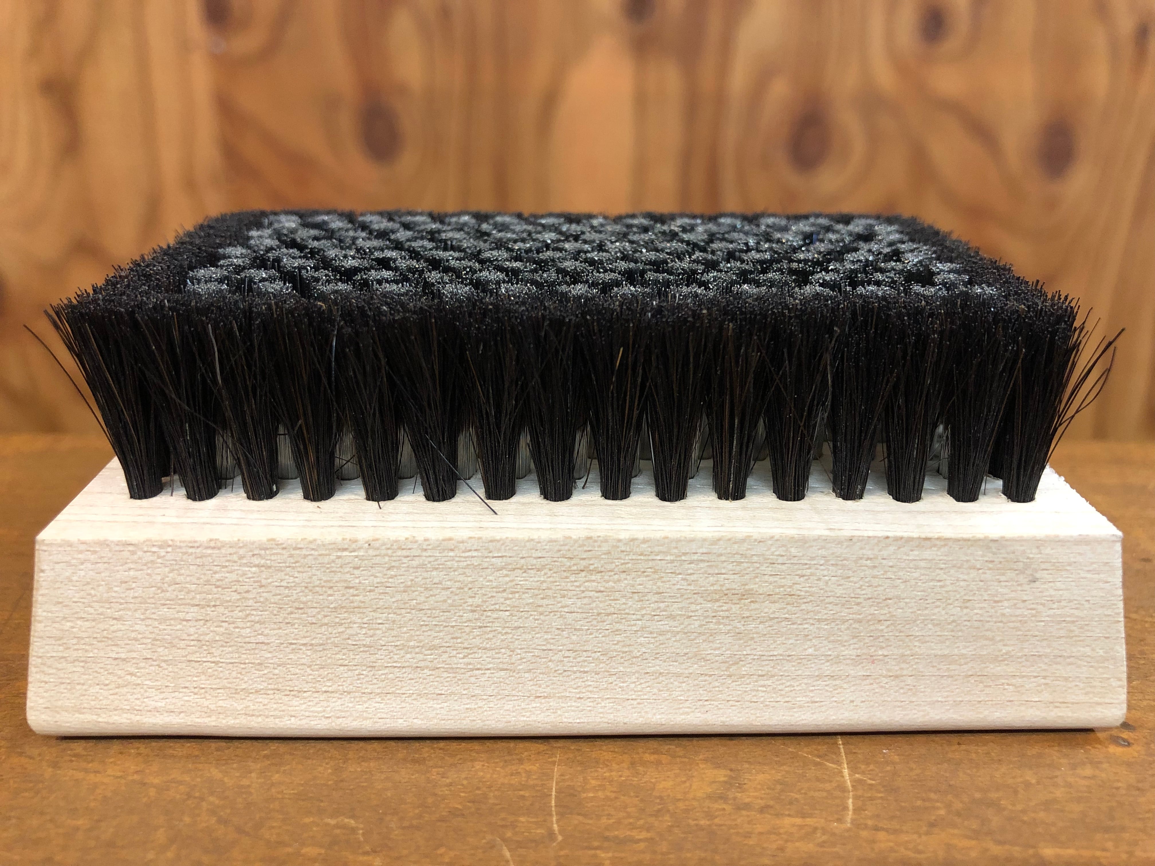 ミクロレベルの非常に細いステンレススティールとホースヘアーのコンビ。これ1個でワックスの荒削りから仕上げまで完璧にこなすことができます。ブラスに比べ耐久性が高く、より毛足が細いためにストラクチャー内のワックスもしっかりかき出すことができ、ソールを傷つけることもありません。